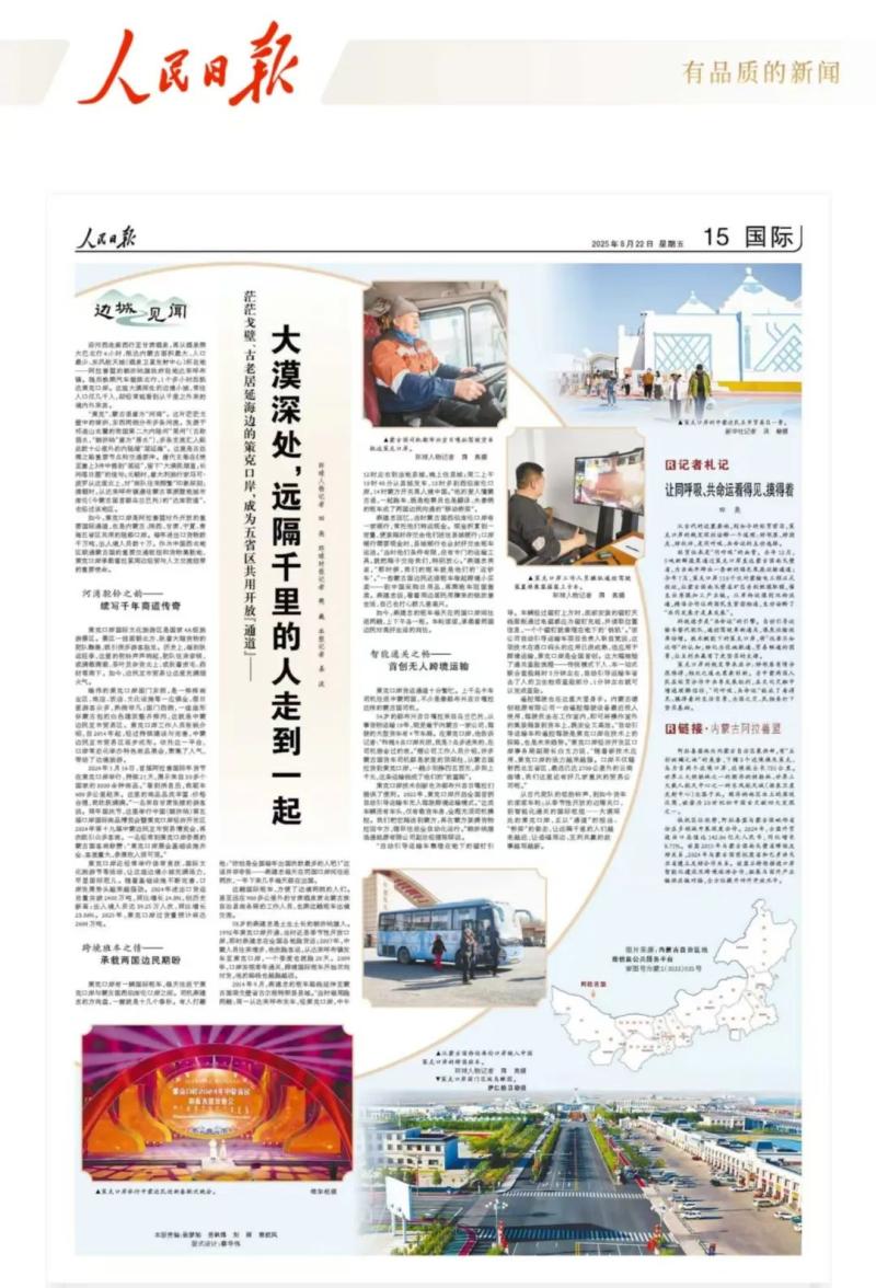 8月22日,《人民日報(bào)》國際版“邊城見聞”專欄整版聚焦阿拉善盟策克口岸,以小故事小切口,見證阿拉善盟與周邊經(jīng)貿(mào)往來、人文交流的生動(dòng)實(shí)踐,展示了阿拉善盟高水平對外開放取得的豐碩成果,唱響了一曲親誠惠容行大道、命運(yùn)與共開新篇的贊歌。全文如下: