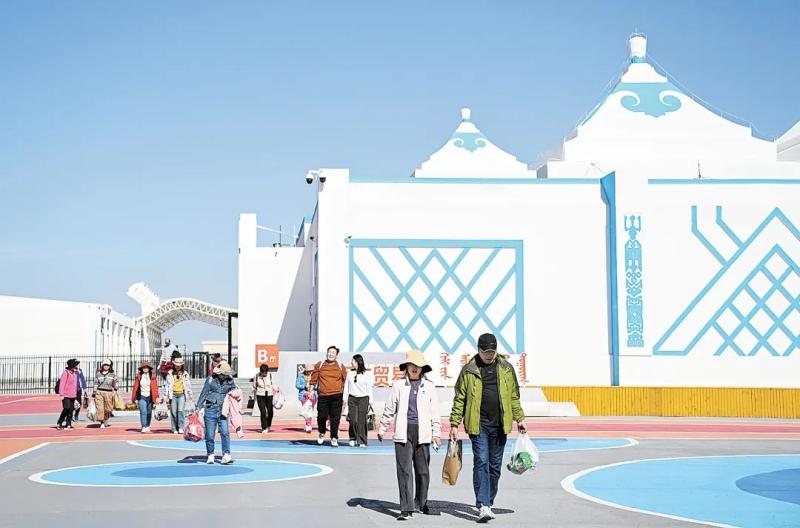 雄偉的策克口岸國門東側(cè),是一排排商業(yè)區(qū),商店、飯店、文化設(shè)施等一應(yīng)俱全,假日里游客眾多,熱鬧非凡;國門西側(cè),一座座形似蒙古包的白色建筑整齊排列,這就是中蒙邊民互市貿(mào)易區(qū)。策克口岸工作人員張銳介紹,自2014年起,經(jīng)過持續(xù)建設(shè)與完善,中蒙邊民互市貿(mào)易區(qū)逐步成形。依托這一平臺(tái),口岸常態(tài)化舉辦特色商品展會(huì),聚集了人氣,帶動(dòng)了邊境旅游。