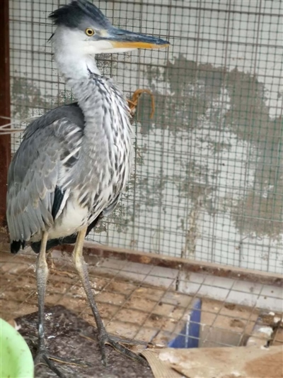 經(jīng)有經(jīng)驗的民警辨認,這是一只蒼鷺幼鳥。這只鳥身高約70公分,長長的尖嘴,身著灰色體羽,頭戴深灰色羽冠,兩條大長腿格外顯眼,白色的前頸縱向排列著黑灰色條紋。民警聯(lián)系獸醫(yī)為其做了體檢,經(jīng)檢查,這只鳥并無傷病,可能是由于剛出窩飛行能力不強、捕食能力不足,造成體力虛弱。民警買來小魚,只見這只鳥狼吞虎咽享用起來,不久便精神十足,開始啄民警。看到它體力開始恢復(fù),民警懸著的心也就放下了。民警計劃選擇合適時間和地方將其放飛。