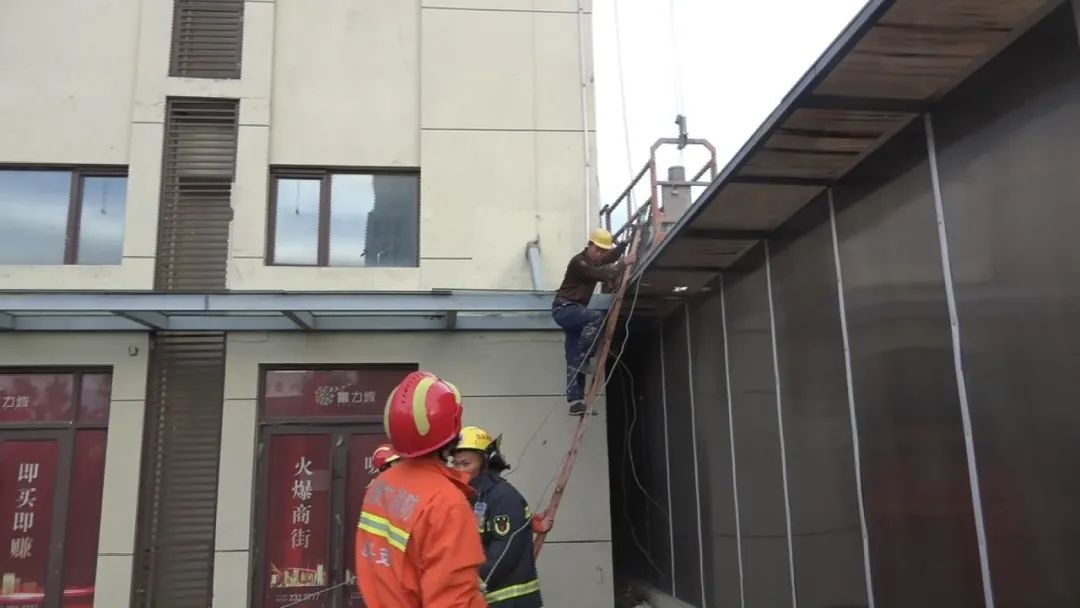 17時(shí)16分,包頭市消防救援支隊(duì)健康路消防站接到指揮中心派警后,立即出動(dòng)2輛消防車、10名消防隊(duì)員火速趕到現(xiàn)場(chǎng)。消防隊(duì)員觀察發(fā)現(xiàn),一名負(fù)責(zé)粉刷大樓外墻的工人被困在公寓外7-8樓之間吊籃中,大顆大顆的冰雹打在他身上,升降機(jī)器鋼絲繩在風(fēng)雨中被纏繞在一起,吊籃無(wú)法升降。由于天氣惡劣,風(fēng)速很大,情況十分危險(xiǎn)。