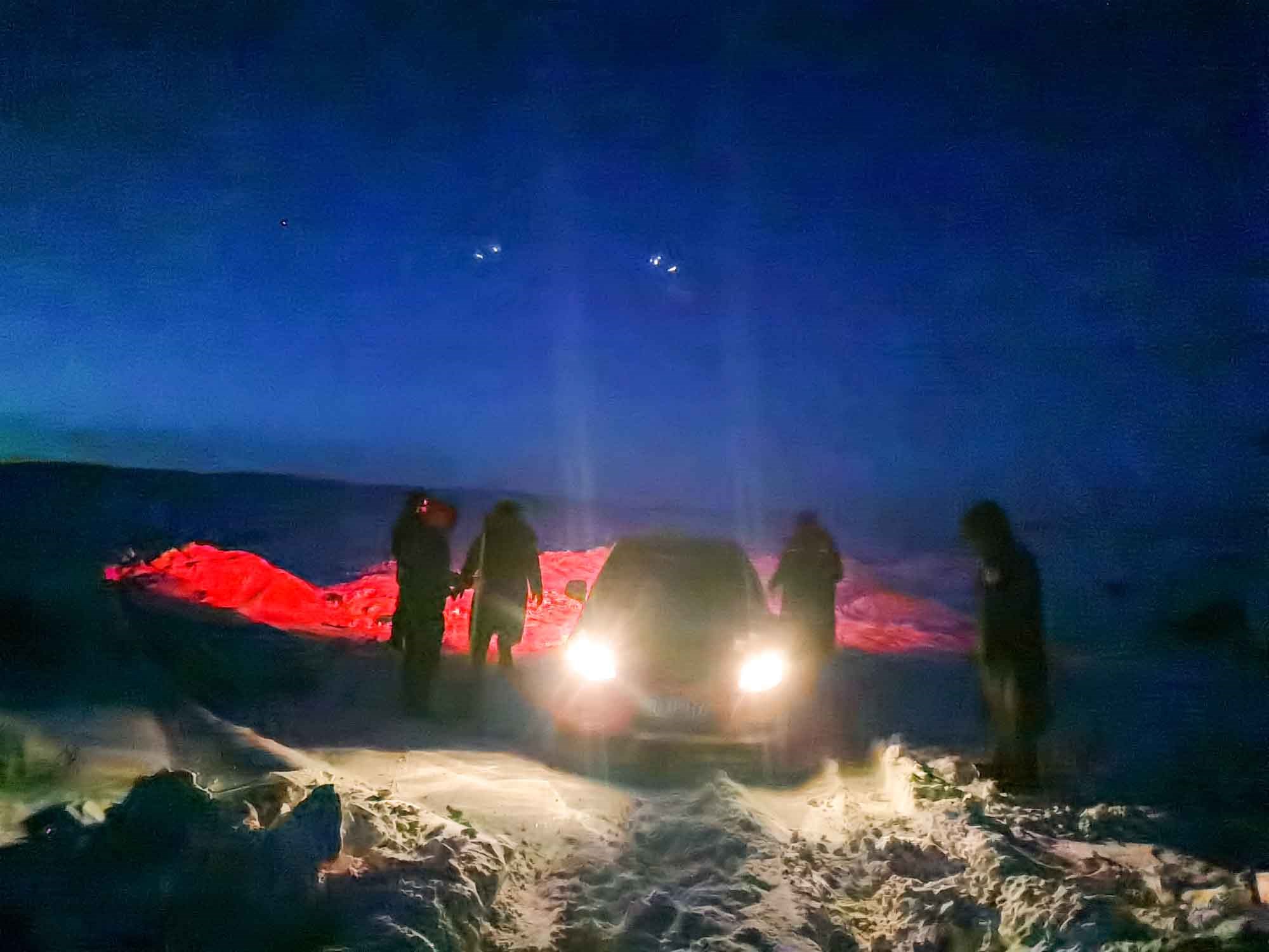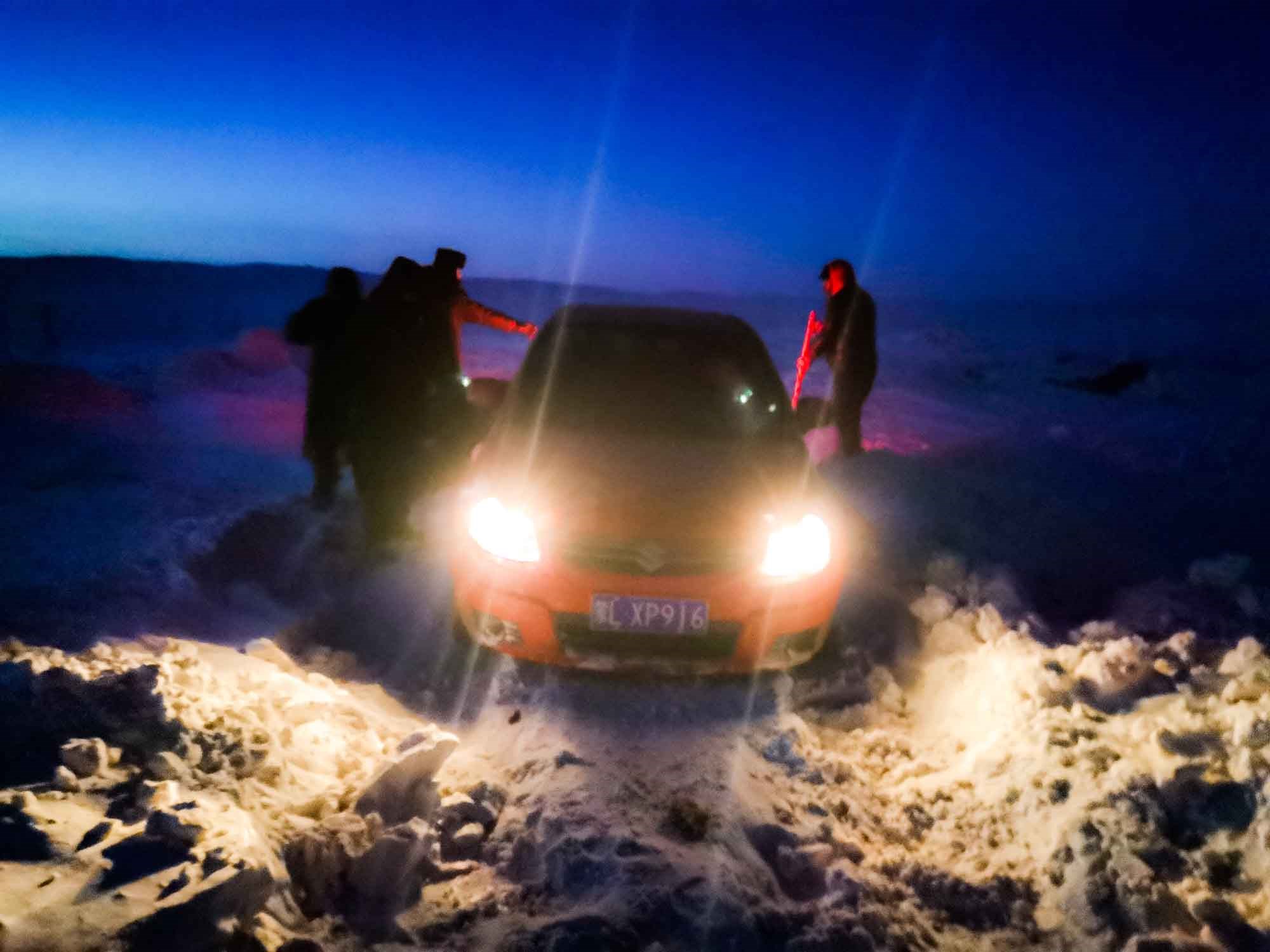 1月17日17時(shí),那木吉拉與弟弟一同駕車(chē)返回百靈廟鎮(zhèn),在途經(jīng)一處被風(fēng)谷地時(shí),由于晚上視線較差,且此處坡度較大,不慎陷入雪中無(wú)法動(dòng)彈,只得撥通電話請(qǐng)求派出所救助。草原上沒(méi)有遮蔽物,常常到了下午就刮起大風(fēng),吹得積雪覆蓋在土地上分不清地勢(shì)高低,民警們按著平日下鄉(xiāng)走訪的經(jīng)驗(yàn)摸索前進(jìn),經(jīng)過(guò)近一小時(shí)才到達(dá)現(xiàn)場(chǎng),了解情況后,民警們將準(zhǔn)備好的熱水和棉大衣遞給牧民便展開(kāi)了救援工作。在零下35度的冬夜里,民警們用鐵鍬和雙手經(jīng)過(guò)近兩個(gè)小時(shí)的奮戰(zhàn)終于將40厘米厚的積雪清理干凈,并將被困車(chē)輛通過(guò)前拉后推的方式移至平坦區(qū)域。