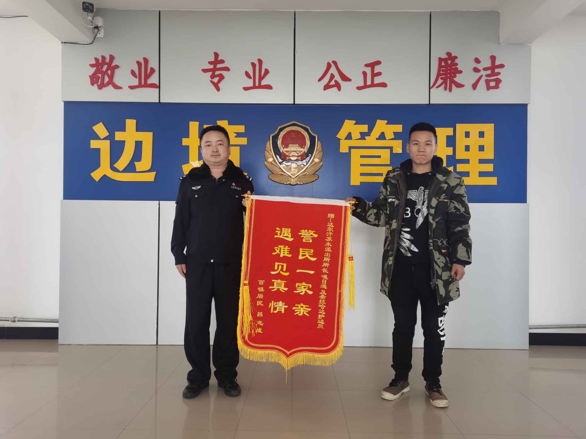 “民警同志太感謝你們了,有你們?cè)谖覀兙透杏X(jué)安心多了?!?月19日早晨,內(nèi)蒙古包頭市達(dá)茂旗達(dá)爾罕蘇木牧民那木吉拉“嘎吱嘎吱”的踩著潔白的積雪走進(jìn)包頭邊境管理支隊(duì)達(dá)爾罕邊境派出所,一邊說(shuō)著一邊拿出印有“警民一家親,遇難見(jiàn)真情”的錦旗遞給民警。