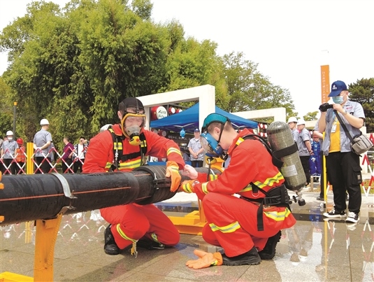 陣陣白煙模擬的是道路中壓燃?xì)夤艿佬孤?,接到?bào)警后,119消防指揮中心第一時(shí)間通過(guò)應(yīng)急聯(lián)絡(luò)系統(tǒng)通知住建部門和燃?xì)馄髽I(yè)到場(chǎng)處置,同時(shí)消防救援力量到達(dá)現(xiàn)場(chǎng)對(duì)泄漏點(diǎn)進(jìn)行處置。接到通知后,中浩燃?xì)夤緭屝藜皯?yīng)急處置人員到達(dá)現(xiàn)場(chǎng),對(duì)泄漏區(qū)域20米范圍內(nèi)進(jìn)行圍擋警戒,并攜帶可燃?xì)怏w檢測(cè)儀對(duì)周邊環(huán)境進(jìn)行檢測(cè),以防人員受傷,保證作業(yè)安全。應(yīng)急處置人員佩戴空氣呼吸器進(jìn)入現(xiàn)場(chǎng),確定漏點(diǎn)及管道尺寸,用膠帶對(duì)漏點(diǎn)進(jìn)行臨時(shí)處理,加裝管道抱卡,臨時(shí)封堵管道?,F(xiàn)場(chǎng)指揮人員根據(jù)處置情況,集結(jié)隊(duì)伍,利用運(yùn)行不停輸維修設(shè)備進(jìn)行管道維修。這一連串的操作下來(lái),泄漏點(diǎn)被及時(shí)修好。負(fù)責(zé)此次演練的內(nèi)蒙古中浩燃?xì)庥邢薰究偨?jīng)理賈鵬程介紹,這套不停輸管道維修設(shè)備,既節(jié)約了成本,又能保證安全供氣,能更好地服務(wù)保障廣大市民群眾。