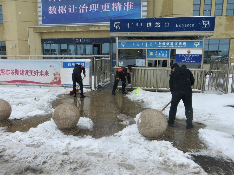 4月3日,受極端惡劣天氣影響,鄂爾多斯市東勝東車站派出所轄區(qū)內(nèi)連降雨夾雪,車站進(jìn)出站口積雪、積水嚴(yán)重,給旅客群眾出行帶來(lái)不便。