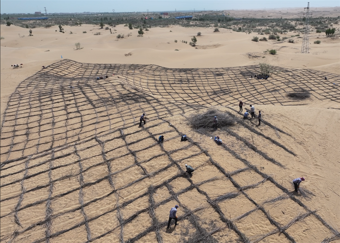 在鄂爾多斯市庫布其沙漠S215穿沙公路沙化土地綜合治理項(xiàng)目現(xiàn)場,工人正在鋪設(shè)沙障。(資料圖)