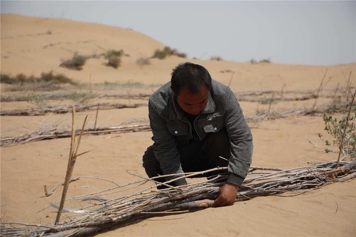 在鄂爾多斯市庫布其沙漠S215穿沙公路沙化土地綜合治理項(xiàng)目現(xiàn)場,工人正在固定沙障。(資料圖)