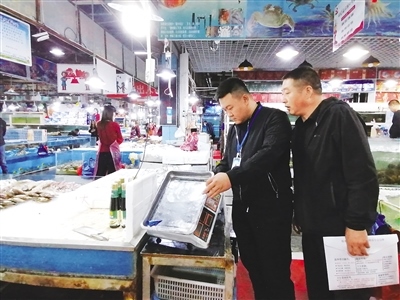 執(zhí)法人員檢查海鮮市場(chǎng)內(nèi)的電子秤