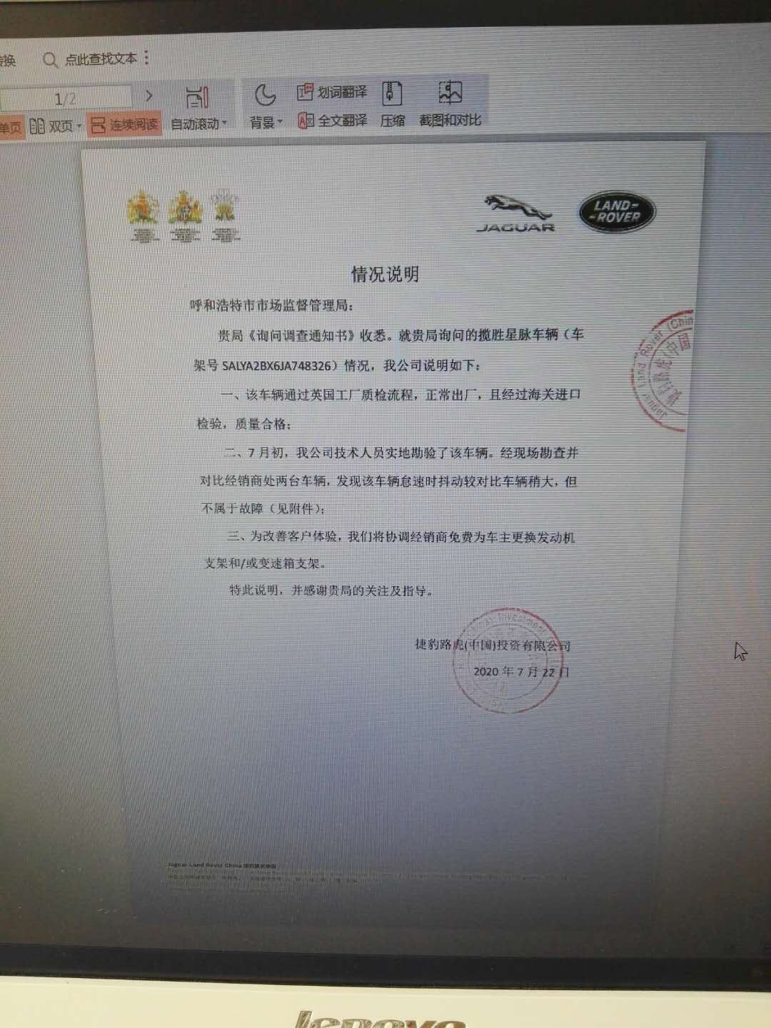 今年5月初,李女士將此事投訴到了呼和浩特市市場監(jiān)督管理局。經執(zhí)法人員調查,李女士反映的情況屬實。隨后,在執(zhí)法人員的關注下,路虎總部還派人來查看該車輛,但是堅稱該車沒有質量問題。此后,該局向路虎總部發(fā)出了《詢問調查通知書》。7月22日,捷豹路虎(中國)投資有限公司向該局回函稱:“1.該車通過英國工廠質檢流程,正常出廠,而且經過海關進口檢驗,質量合格。2.7月初,我公司技術人員實地勘驗了該車輛,經現場勘察并且對比經銷商(順馳路捷)處兩臺車輛,發(fā)現該車輛怠速時抖動較對比車輛稍大,但不屬于故障。3.為改善客戶體驗,我們將協(xié)調經銷商免費為車主更換發(fā)動機支架和/或變速箱支架?!?/p>
