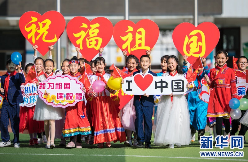 9月29日,內(nèi)蒙古呼和浩特市玉泉區(qū)五塔寺東街小學(xué)學(xué)生在主題快閃活動(dòng)上,祝福偉大祖國(guó)繁榮昌盛。新華網(wǎng)發(fā)(丁根厚攝)