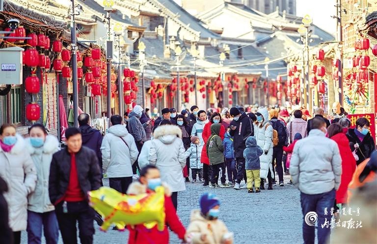 2月15日,人們?cè)诤艉秃铺厥杏袢獏^(qū)塞上老街游玩。當(dāng)日是大年初四,呼和浩特市玉泉區(qū)塞上老街、通順大巷、大召步行街充滿(mǎn)了濃濃的年味兒,吸引人們前來(lái)逛街賞景。內(nèi)蒙古日?qǐng)?bào)社融媒體記者 王磊 攝