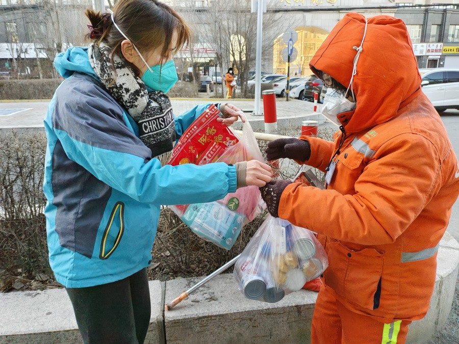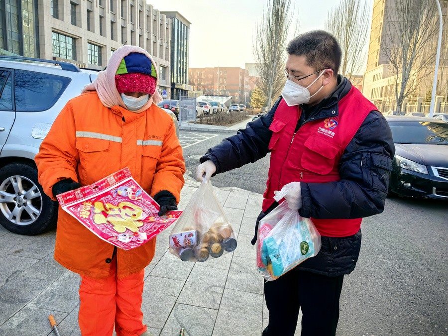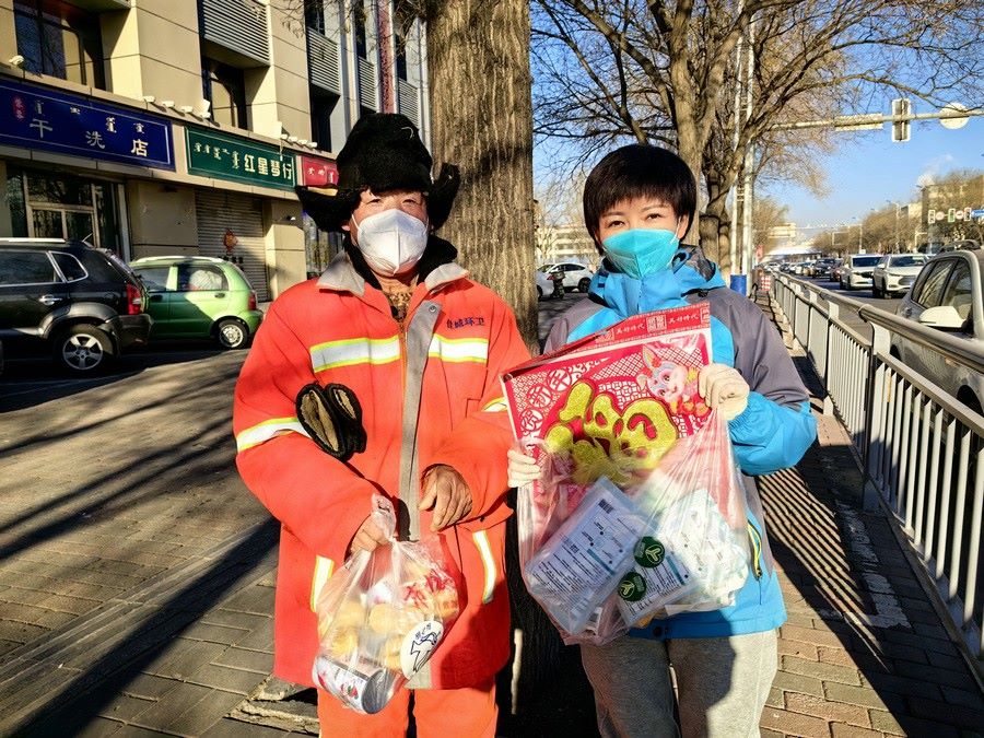大家身穿志愿者馬甲,三五人一組結(jié)伴走上街頭,只要見(jiàn)到正在工作的環(huán)衛(wèi)工人,就會(huì)遞上一份節(jié)日暖心包,里面有臘八粥、小點(diǎn)心、春聯(lián)福字、兔年吉祥物裝飾卡片,還有酒精、口罩等防疫物資。