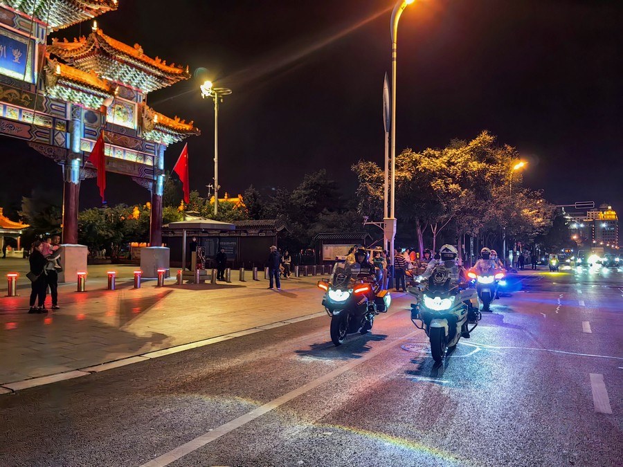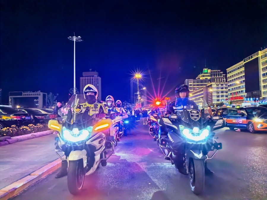 中秋、國(guó)慶兩節(jié)期間,呼和浩特市公安局反恐怖和特巡警支隊(duì)?wèi)?zhàn)鷹突擊隊(duì)與交警支隊(duì)停放管理大隊(duì)鐵騎中隊(duì),聯(lián)合開(kāi)展巡邏防控工作,并組成了一支騎警處突機(jī)動(dòng)隊(duì),成了呼和浩特大街小巷一道亮麗的風(fēng)景線。圖為中秋節(jié)之夜,這支機(jī)動(dòng)隊(duì)開(kāi)展聯(lián)合巡邏,守護(hù)青城百姓平安過(guò)節(jié)。 王鑫 攝影報(bào)道