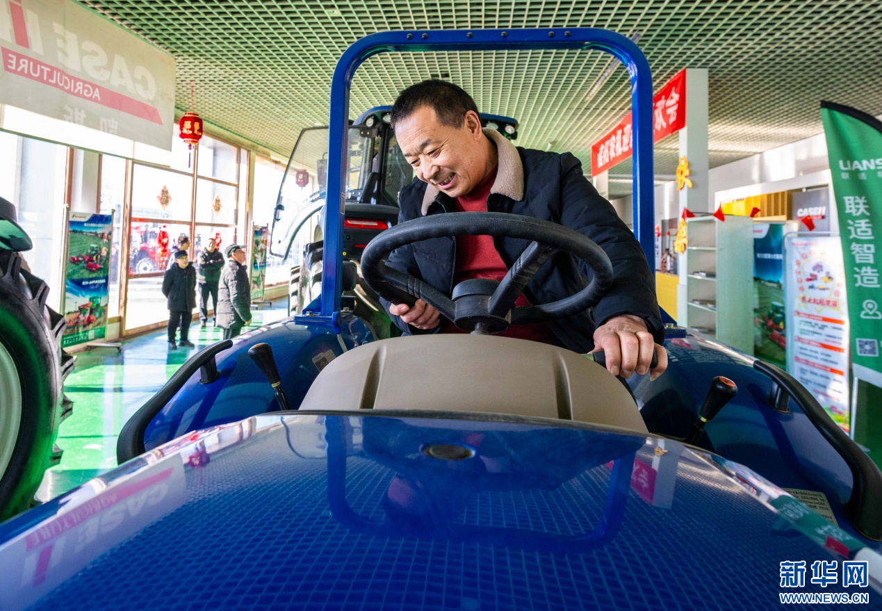 ??2月18日,在位于呼和浩特市玉泉區(qū)的一家農(nóng)機(jī)設(shè)備公司展銷大廳,農(nóng)戶在試駕拖拉機(jī)。新華網(wǎng)發(fā)(丁根厚 攝)