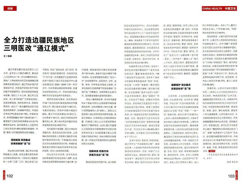 日前,《中國衛(wèi)生》2025年05期刊發(fā)了通遼市衛(wèi)健委主任陳靜同志的署名文章,深度解讀邊疆少數(shù)民族地區(qū)三明醫(yī)改“通遼模式”,這是通遼市衛(wèi)生健康工作首次受到國家衛(wèi)生核心雜志的關(guān)注,標(biāo)志著通遼在衛(wèi)生健康領(lǐng)域的創(chuàng)新實(shí)踐獲國家級權(quán)威認(rèn)可。