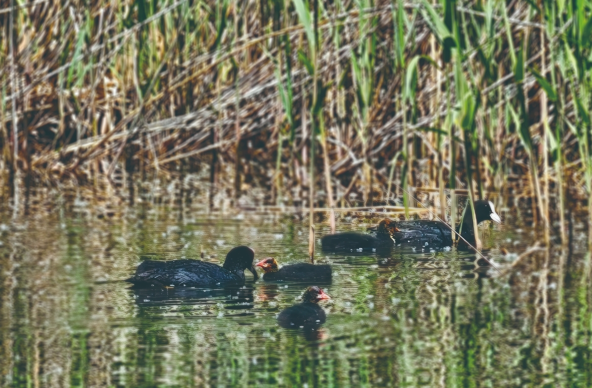 在不遠處的水域,白骨頂雞一家成為眾人關注的焦點。幾只剛剛出窩的幼鳥,圓滾滾、毛茸茸的,正好奇地在水中游動,動作略顯笨拙,還不時發(fā)出稚嫩的叫聲。成年白骨頂雞則忙著覓食,它們一頭扎進水里,再浮出水面時,嘴里已叼著小魚小蝦,隨后快速游向幼鳥喂食。幼鳥們爭搶食物的場景,充滿了趣味。