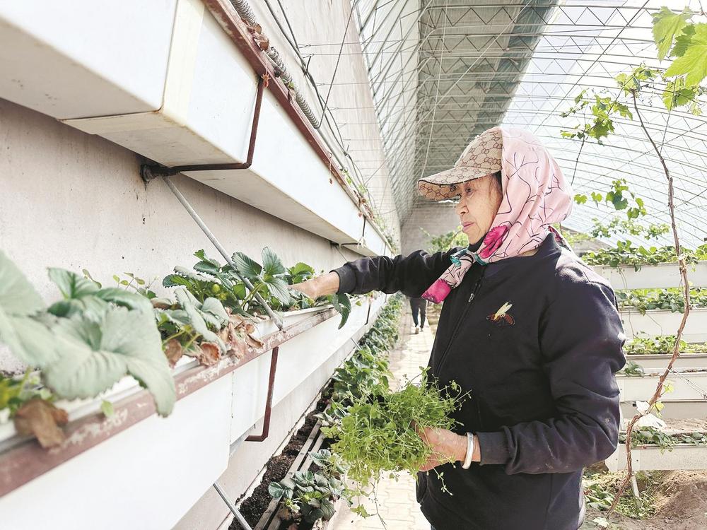 走進(jìn)草莓大棚內(nèi),濃濃的暖意撲面而來。抬眼望去,離地一米多的種植架上種滿了生機(jī)勃勃、長勢喜人的草莓;穿梭在種植架間,一顆顆鮮紅欲滴、圓潤飽滿的草莓宛如璀璨的紅寶石,從綠葉間“探出頭”來,高高地懸掛在空中,散發(fā)著誘人的清香。種植戶牛尚海正在察看采用立體栽培技術(shù)的草莓長勢情況。“這是一種三維立體種植方式,能夠充分利用空間和光照,大幅度提高生產(chǎn)效率。以前一畝地最多種8000株,現(xiàn)在能種2.4萬株,產(chǎn)量提高了3倍,而且草莓個(gè)頭更均勻,賣相更好?!迸I泻8嬖V記者,這種種植方式不僅省工、省力,還降低了勞動強(qiáng)度,摘草莓也不用彎腰了。此外,這種種植模式比傳統(tǒng)種植模式每畝節(jié)水50%。