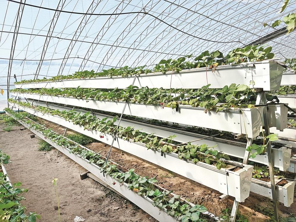 草莓在種植架上長勢良好。