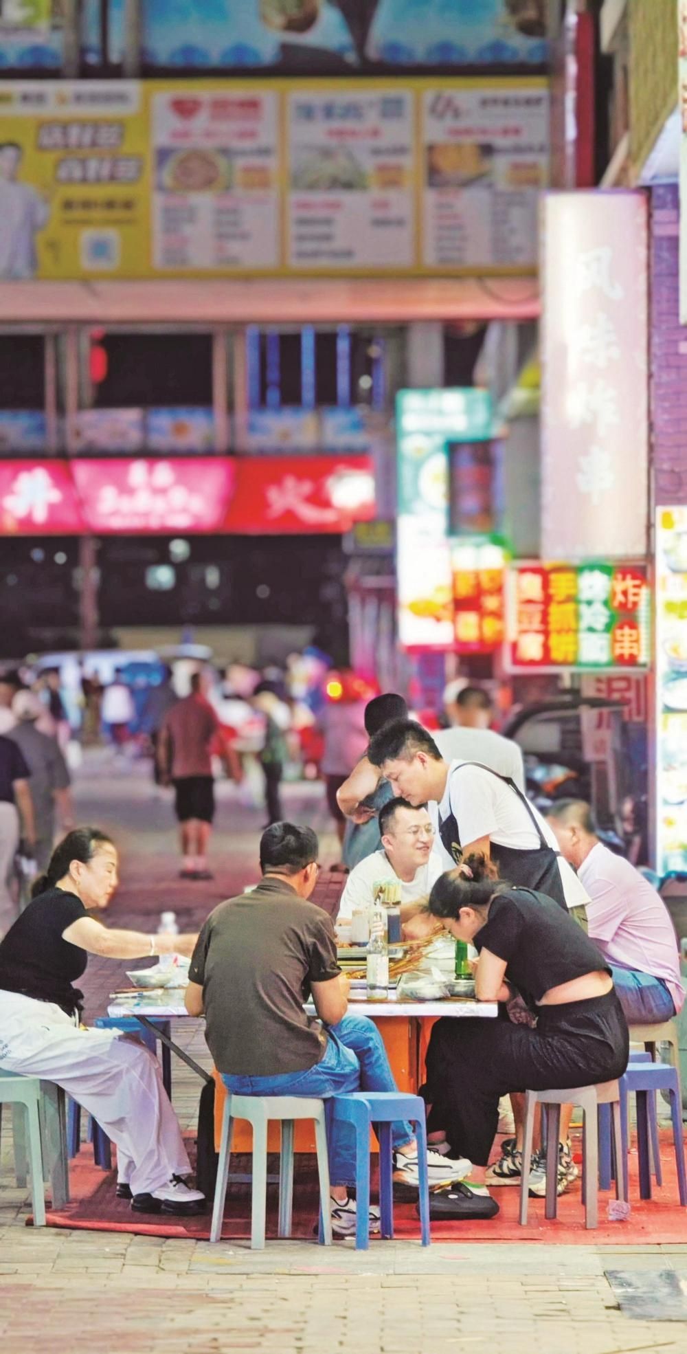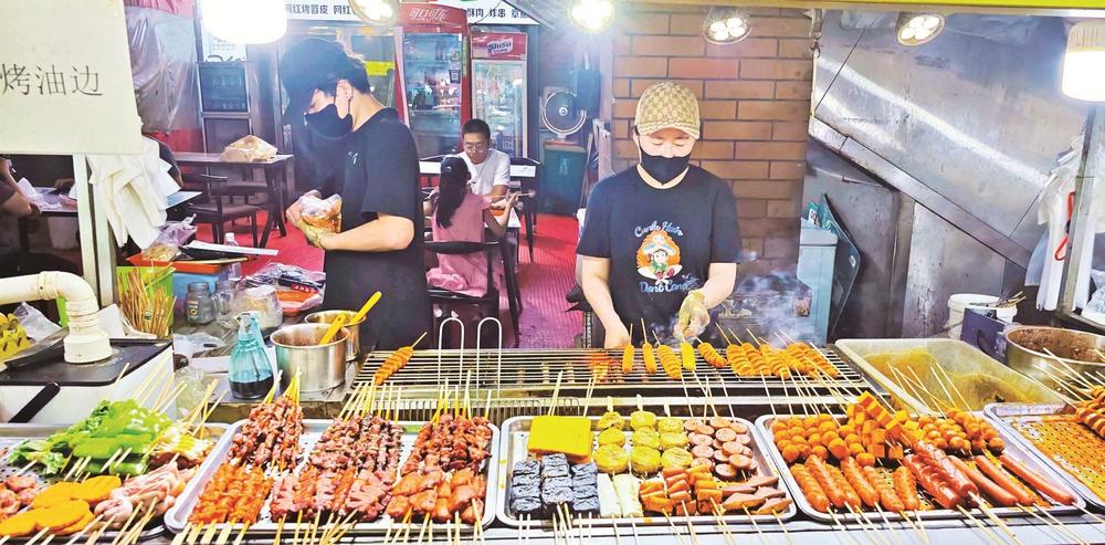 炭火上的羊肉串嗞嗞作響,油脂滴落,迸出金色火花,散發(fā)出誘人的香氣??腿藝谒芰闲∽琅?,手里拿著冰鎮(zhèn)啤酒,碰杯傳出清脆的響聲……這里沒有高檔餐廳的拘謹,只有朋友相聚的歡樂和大口吃肉的暢快。大學生徐瑞虹放暑假后,經(jīng)常和朋友來夜市消暑?!拔覀儙讉€沒事就來萬達金街轉(zhuǎn)一轉(zhuǎn),天太熱了,待在家里也悶,而且夜市里的這些小吃我們都比較喜歡,沒事幾個人喝幾瓶啤酒,聊一聊天,感覺還是很愜意的?!睂τ谀贻p人來說,夜市不僅是美食的聚集地,更是釋放壓力、享受生活的好去處。在這里,他們可以暫時拋開煩惱,盡情享受美食帶來的快樂。