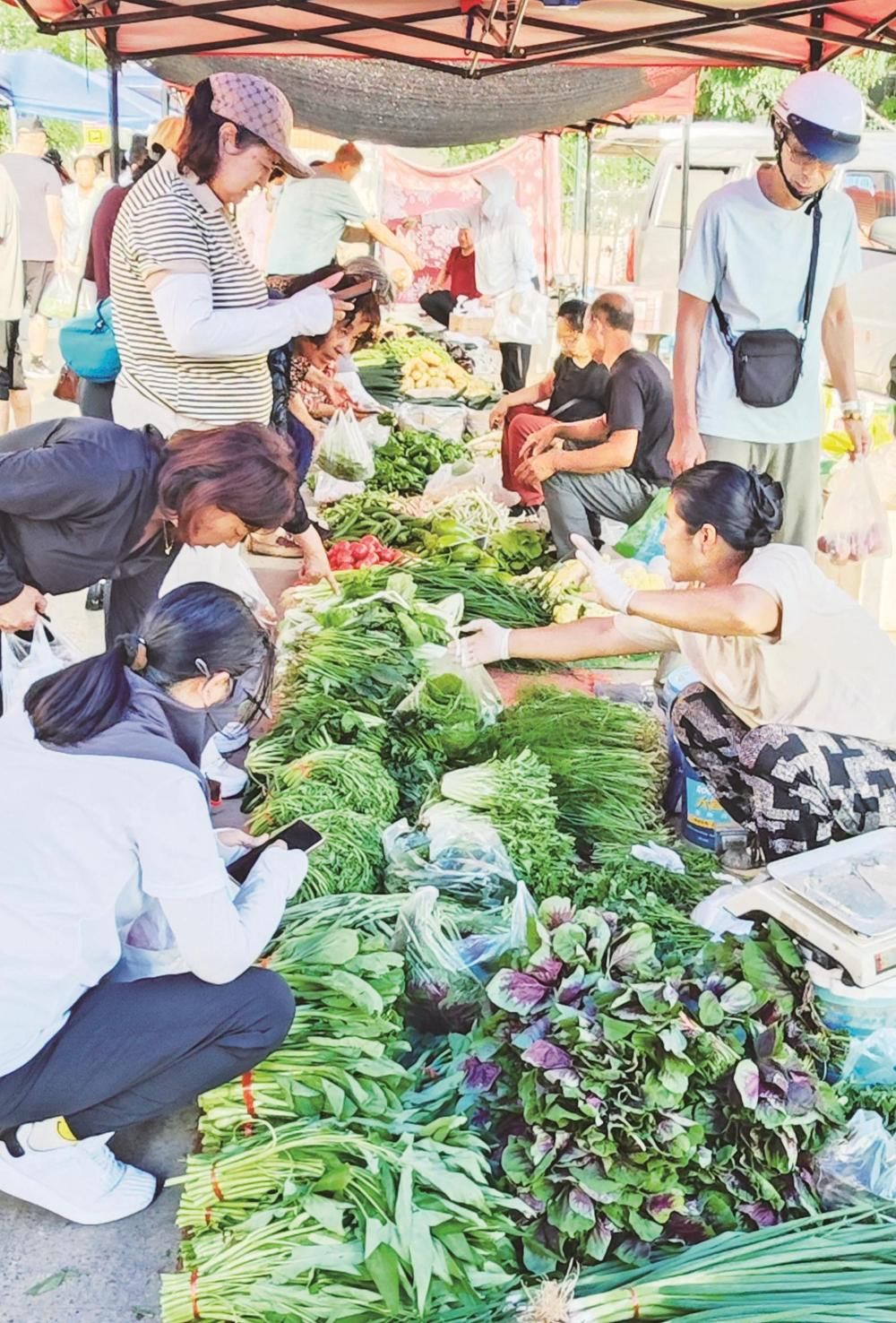 夏日的早市里,菜攤攤主牛麗梅就已經(jīng)擺放好新鮮的蔬菜,泡沫箱里的黃瓜頂著嫩黃的花,筐里的西紅柿還帶著露珠,“這些菜都是半夜起來從地里現(xiàn)摘的,你看看這黃瓜頂花帶刺的,多新鮮。我已經(jīng)在這個早市擺了十來年攤了,人們還是很認可我家的蔬菜,就是累點也覺得挺高興的?!彼裏崆榈卣泻糁皝碣I菜的市民,過秤、算賬,干脆利落,一看就有著豐富的賣菜經(jīng)驗。