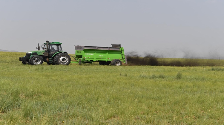 在退化放牧場(chǎng)治理區(qū),施工人員用推土機(jī)推平坑洼不平的風(fēng)蝕坑、整理?xiàng)壨炼?;按照噴幅?~8米的行距,用拋肥機(jī)將牛羊固態(tài)糞肥和含有氮、磷、鉀等生物有機(jī)液態(tài)肥拋灑在草場(chǎng)上,增加土壤肥力;用切根機(jī)將稀疏的羊草切開(kāi)、促進(jìn)分蘗繁殖、復(fù)壯,增加種群密度;采用栽設(shè)4×4米網(wǎng)格狀沙幛、覆蓋草簾來(lái)降溫保墑抗旱保苗,與此同時(shí)與項(xiàng)目區(qū)牧戶簽訂三年的禁牧、生態(tài)補(bǔ)償、管護(hù)協(xié)議。