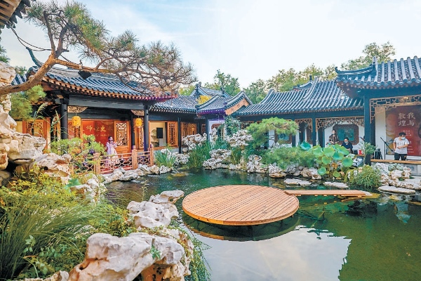 園中一泓池水,清澈如鏡,廊、軒、亭、榭環(huán)繞四周,夾岸有疊石、綠植、繁花,明朗清雅。后樓為展廳,中國當代水墨藝術(shù)家彭薇的作品《有故事的房間》正在展出,觀眾散落其間,駐足欣賞。