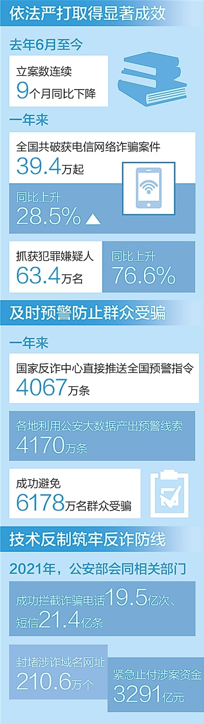 據(jù)介紹,全國公安機關(guān)深入開展“云劍”“長城”“斷卡”“斷流”“5·10”等專項行動,先后組織開展150次全國集群戰(zhàn)役。一年來,共破獲電信網(wǎng)絡(luò)詐騙案件39.4萬起,抓獲犯罪嫌疑人63.4萬名,同比分別上升28.5%和76.6%。根據(jù)最新統(tǒng)計,電信網(wǎng)絡(luò)詐騙立案數(shù)連續(xù)9個月同比下降,打擊治理工作取得顯著成效。