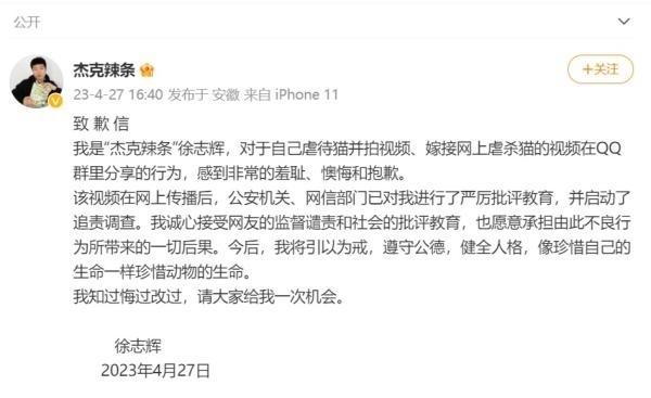 27日16時40分,@杰克辣條 在微博發(fā)表了署名“徐志輝”的致歉信稱,對于自己虐待貓并拍視頻、嫁接網(wǎng)上虐殺貓的視頻在QQ群里分享的行為,感到非常的羞恥、懊悔和抱歉。該視頻在網(wǎng)上傳播后,公安機關(guān)、網(wǎng)信部門已對其進行了嚴厲批評教育,并啟動了追責(zé)調(diào)查。