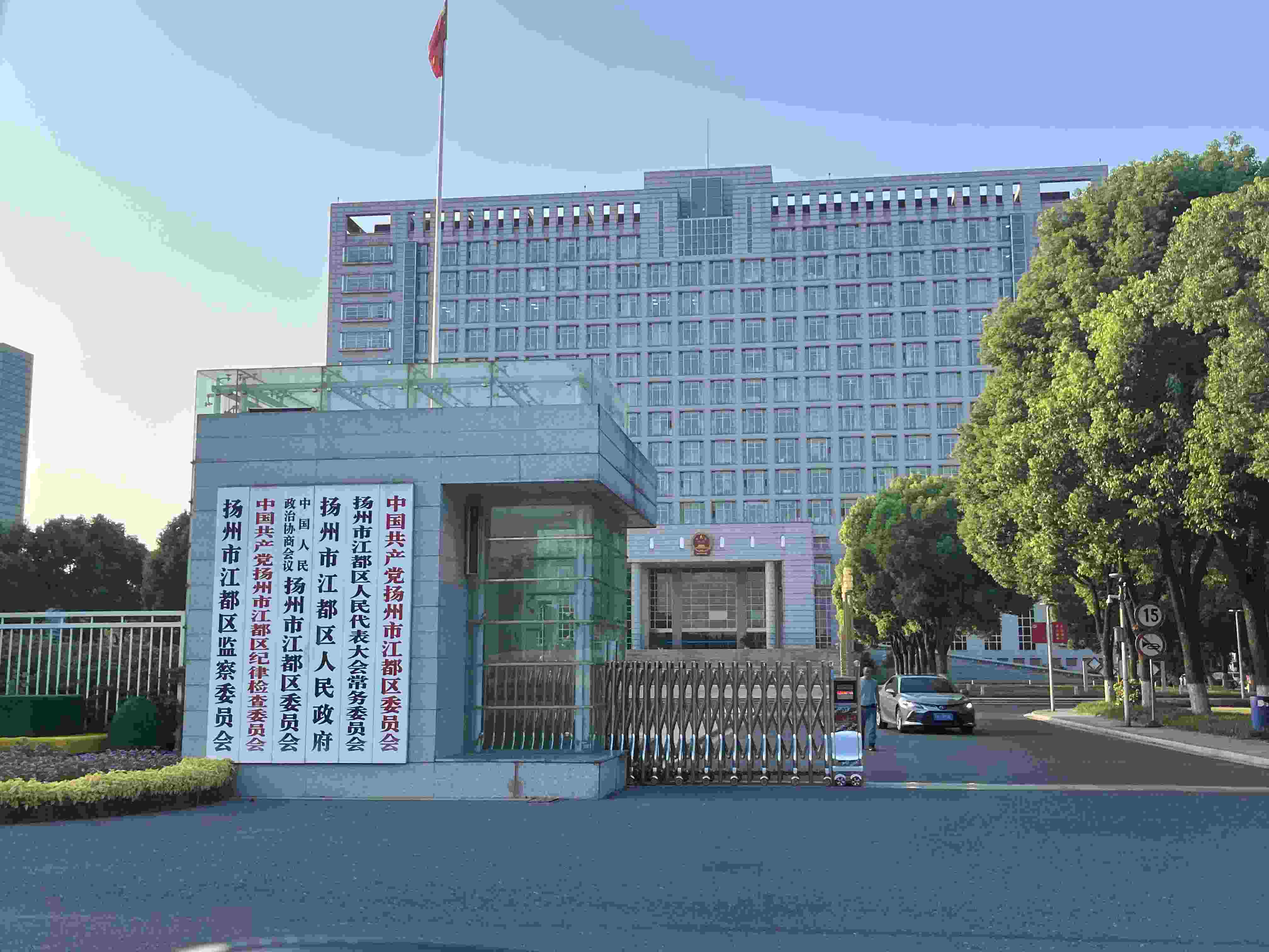 江都區(qū)政府門前?!案邥洝薄皩O主任”曾在此“演戲”騙取受害人信任。