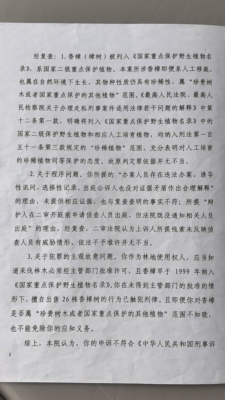 此后,馬萬林向四川省高級人民法院申訴。2019年6月,四川省高院復(fù)查認(rèn)為,本案所涉香樟即便系人工移栽,也屬在自然環(huán)境下生長,其物種性質(zhì)仍具有珍稀性,屬“珍貴樹木或者國家重點(diǎn)保護(hù)的其他植物范圍”,“原判定罪證據(jù)并無不當(dāng)”。