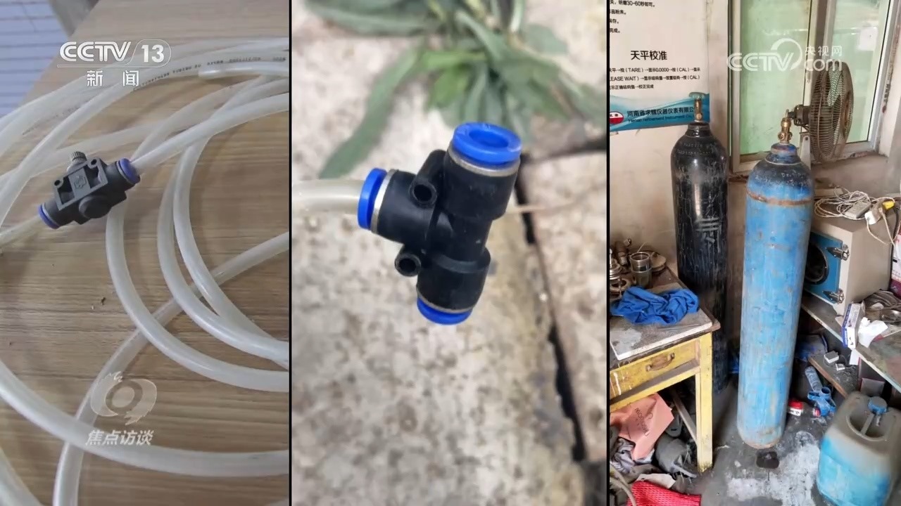 塑料軟管、三通管件、氮氣瓶,就是“環(huán)保科技公司”的人來給磚廠安裝的所謂“環(huán)保設備”,他們把氮氣接入采樣管線,稀釋采樣氣體,從而達到干擾在線監(jiān)測數(shù)據(jù)的目的。