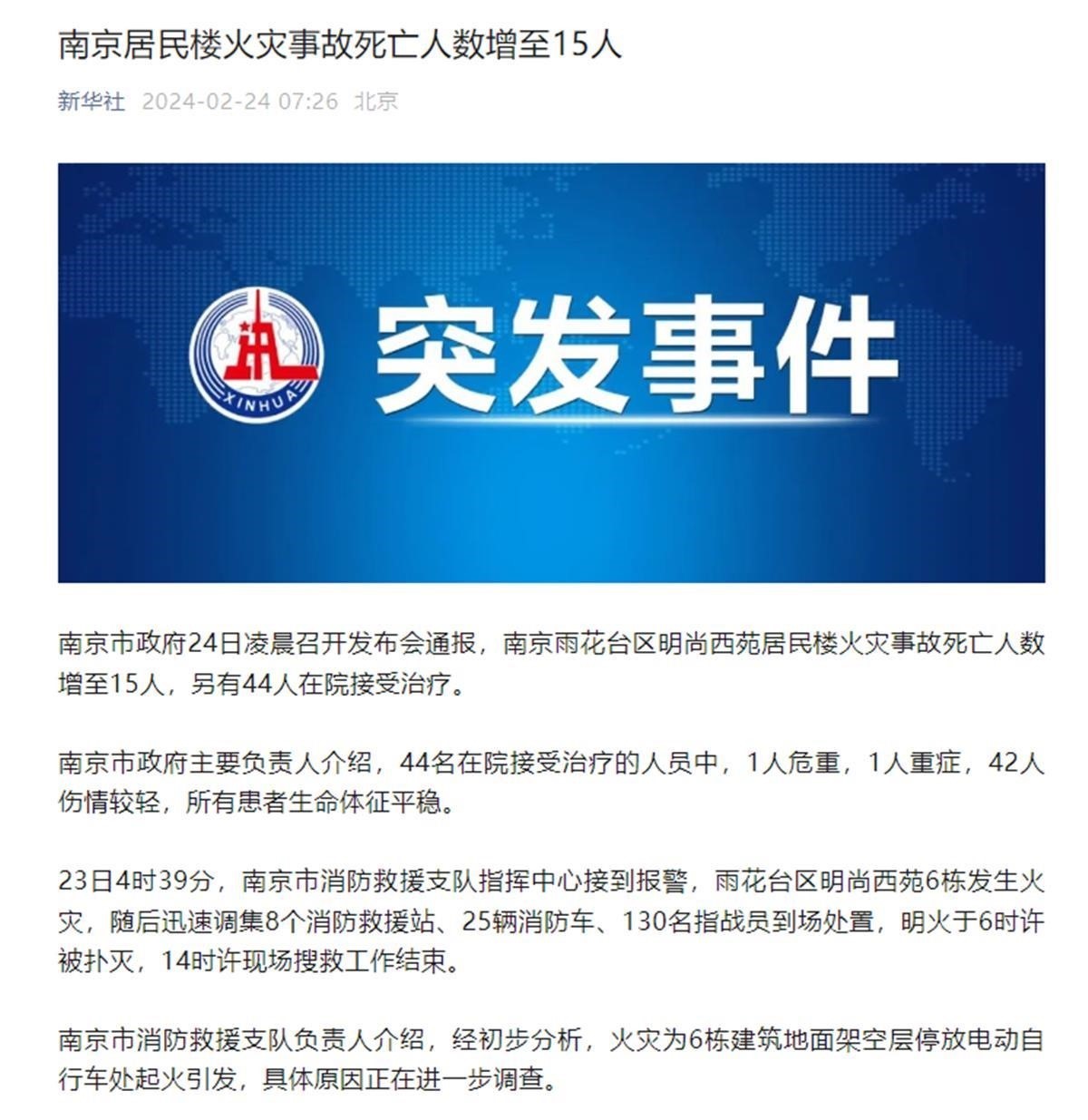 2月24日凌晨,南京市召開新聞發(fā)布會,通報雨花臺區(qū)“2·23”火災事故有關情況。發(fā)布會上介紹,23日凌晨4時39分,南京市消防救援支隊指揮中心接到報警,雨花臺區(qū)明尚西苑6棟發(fā)生火災。本次事故現(xiàn)場明火于當日上午6時左右被撲滅,現(xiàn)場搜救工作于下午2時全部結束。截至23日24時,事故共造成15人遇難,44人在院治療,其中,1人危重,1人重癥,42人傷情較輕,所有患者生命體征平穩(wěn)。南京市消防救援支隊負責人介紹,經初步分析,火災為6棟建筑地面架空層電動自行車停放處起火引發(fā),具體原因正在進一步調查。