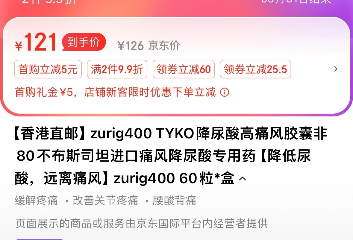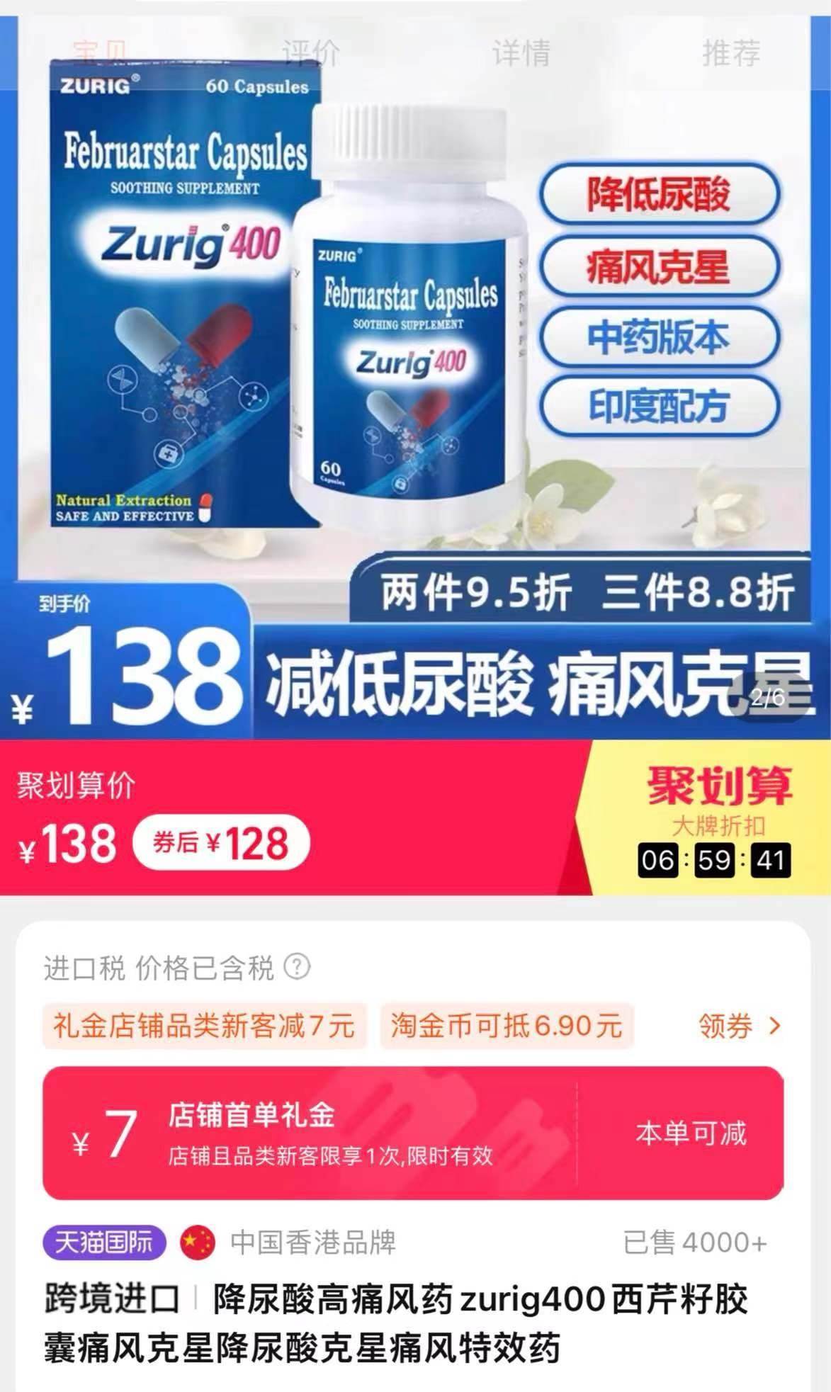 此外,zurig400在銷售頁(yè)面還模仿印度zurig80,宣稱降尿酸、痛風(fēng)藥。澎湃新聞?dòng)浾哒{(diào)查發(fā)現(xiàn),zurig400目前在多個(gè)網(wǎng)購(gòu)平臺(tái)有售,有商家顯示已出售4000+。 經(jīng)了解后得知,印度zurig80實(shí)際上是一款仿制藥,目前國(guó)內(nèi)并未獲批上市;而zurig400卻是一款香港產(chǎn)的保健品類目產(chǎn)品,并非藥品。但產(chǎn)品宣傳時(shí)卻使用“痛風(fēng)特效藥”“印度配方”“中藥非布”等詞語(yǔ),讓患者產(chǎn)生誤會(huì)。
