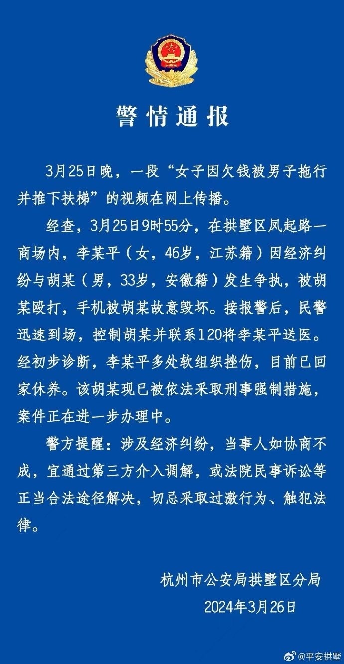 女子欠錢被男子拖下扶梯?杭州警方:涉經(jīng)濟(jì)糾紛 切忌采取過激行為