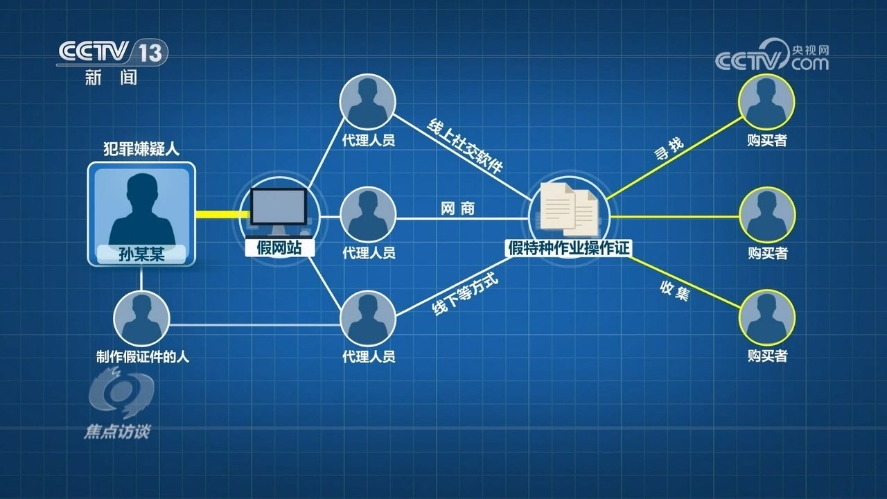 據(jù)介紹,犯罪嫌疑人孫某某是最上游,他首先花錢雇人制作了假網(wǎng)站,然后發(fā)展多名代理人員,代理通過線上社交軟件、網(wǎng)商和線下等方式,尋找、收集花錢購(gòu)買假的特種作業(yè)操作證的人員。由專門負(fù)責(zé)制作假證件的人,制作好假證,發(fā)送給相應(yīng)的下線代理人員,最后到購(gòu)買者手里。