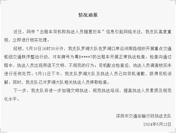 經(jīng)核,5月10日16時(shí)30分許,深圳市交通運(yùn)輸行政執(zhí)法支隊(duì)羅湖大隊(duì)在羅湖口岸沿河南路組織開(kāi)展重點(diǎn)交通樞紐交通秩序整治行動(dòng),對(duì)車(chē)牌號(hào)為粵B****7的出租車(chē)開(kāi)展正常執(zhí)法檢查。檢查溝通過(guò)程中,執(zhí)法人員出現(xiàn)用語(yǔ)不文明、不規(guī)范的行為;司機(jī)配合檢查后,執(zhí)法人員調(diào)查核實(shí)未進(jìn)行任何處罰。5月11日下午,深圳市交通運(yùn)輸行政執(zhí)法支隊(duì)羅湖大隊(duì)及執(zhí)法人員己向司機(jī)道歉,獲得司機(jī)諒解。同時(shí),深圳市交通運(yùn)輸行政執(zhí)法支隊(duì)已對(duì)羅湖大隊(duì)相關(guān)執(zhí)法人員停職檢查。
