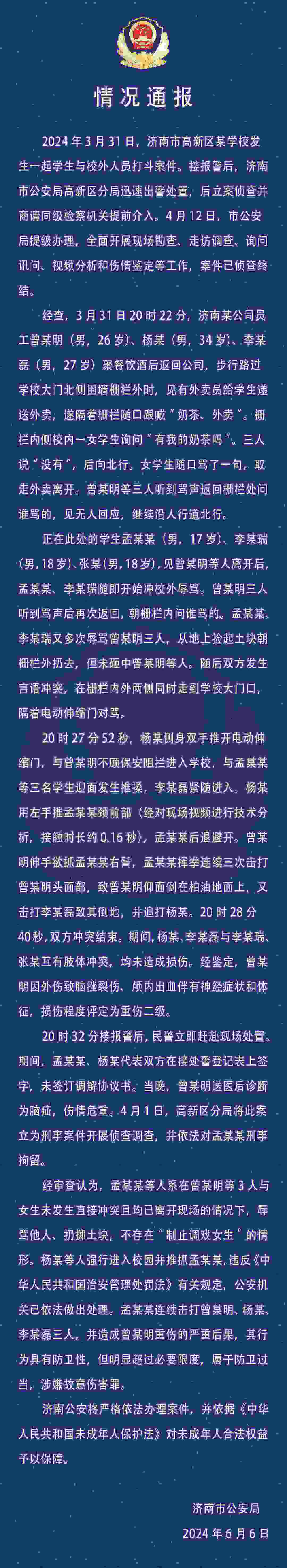 學(xué)生與醉漢沖突、被拘留 濟南警方:涉事學(xué)生屬于防衛(wèi)過當