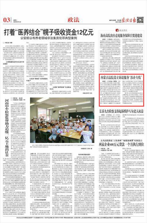 2025年8月12日,《法治日報》第3版刊發(fā)題為《內(nèi)蒙古法院設(shè)立訴訟服務(wù)“涉企專線”》的文章,報道了自治區(qū)高院在全區(qū)法院集中開展規(guī)范涉企執(zhí)法司法專項行動以來,全區(qū)法院認真查糾立案環(huán)節(jié),全面查糾案件審理,深入開展“公開透明 規(guī)范高效”提升年行動。