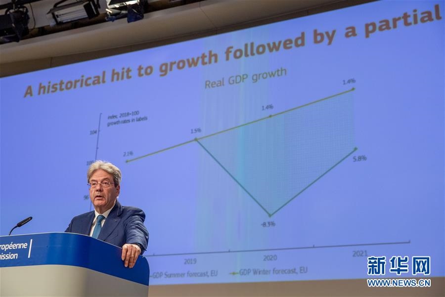 這是7月7日,負(fù)責(zé)經(jīng)濟(jì)事務(wù)的歐委會(huì)委員保羅·真蒂洛尼在位于比利時(shí)布魯塞爾的歐盟委員會(huì)總部就歐盟經(jīng)濟(jì)預(yù)測(cè)出席新聞發(fā)布會(huì)。歐盟7日發(fā)布夏季經(jīng)濟(jì)預(yù)測(cè)報(bào)告說(shuō),由于放松新冠疫情防控措施的步伐比原計(jì)劃緩慢,歐盟和歐元區(qū)今年經(jīng)濟(jì)萎縮程度將比此前預(yù)期更嚴(yán)重,明年復(fù)蘇也將更緩慢。新華社發(fā)(歐盟供圖)