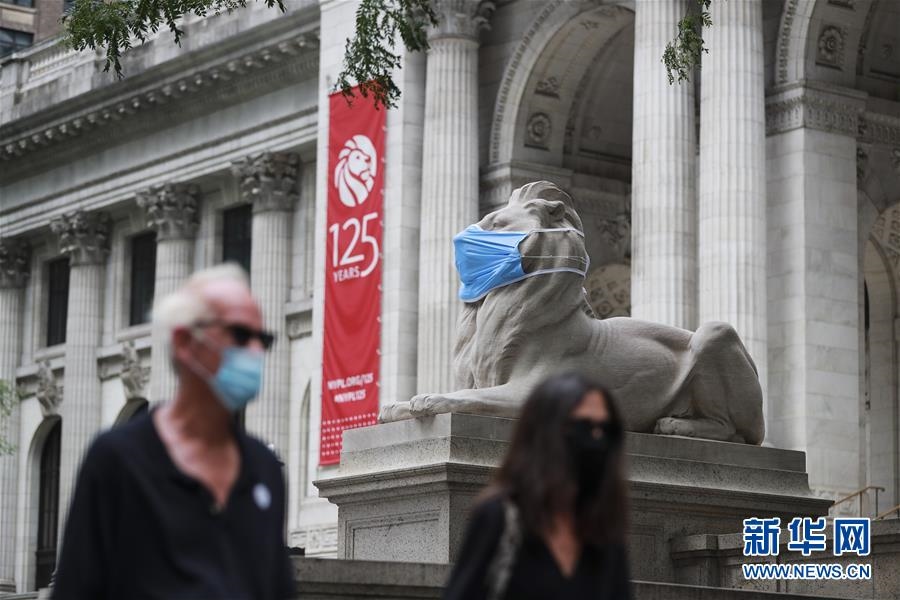 這是7月8日在美國(guó)紐約公共圖書館前拍攝的“戴”口罩的石獅子。新華社記者王迎攝