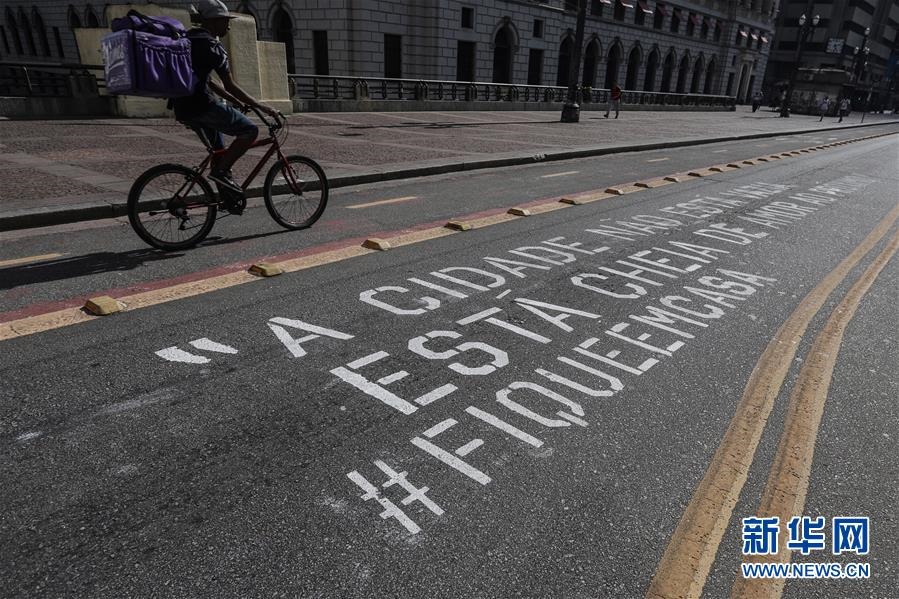 這是4月21日,巴西圣保羅市的一條道路上寫有“城市不是空的,而是充滿著鄰里間的關(guān)愛(ài)#待在家中”字樣。新華社發(fā)(拉赫爾·帕特拉索攝)
