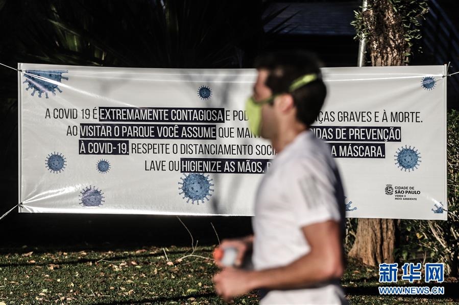 這是7月13日,在巴西圣保羅市重新開放的伊比拉普埃拉公園內(nèi),一名男子經(jīng)過(guò)提醒游客做好防護(hù)的條幅。新華社發(fā)(拉赫爾·帕特拉索攝)