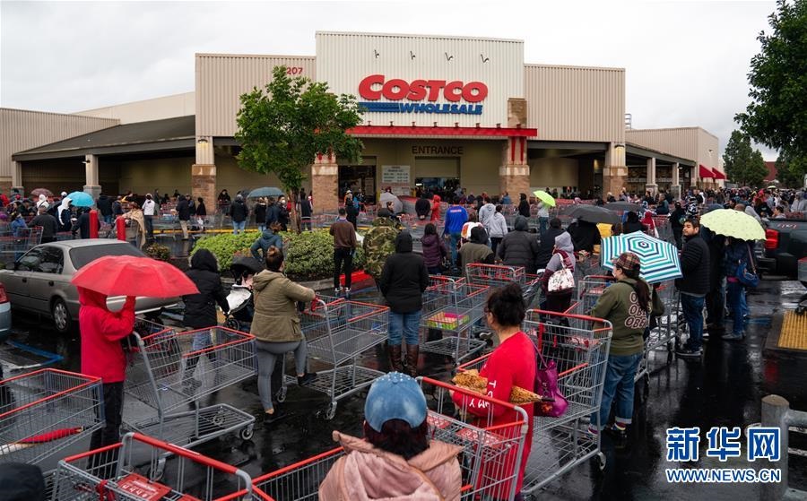 這是3月14日,在美國(guó)洛杉磯一家超市外,民眾冒雨排隊(duì)等候開門購(gòu)物。新華社發(fā)(錢衛(wèi)忠攝)