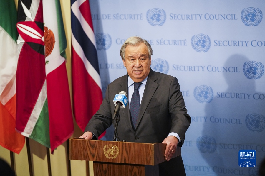 2月23日,在紐約聯(lián)合國總部,聯(lián)合國秘書長古特雷斯在安理會審議烏克蘭問題緊急會議結束后講話。 新華社記者 王迎 攝