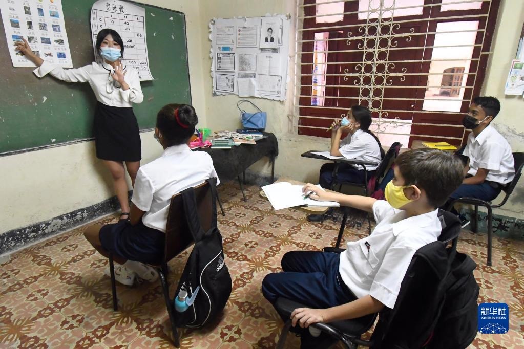 3月7日,中國教師侯嘉琪(左一)在古巴首都哈瓦那的羅德里格斯中學(xué)為學(xué)生上中文課。