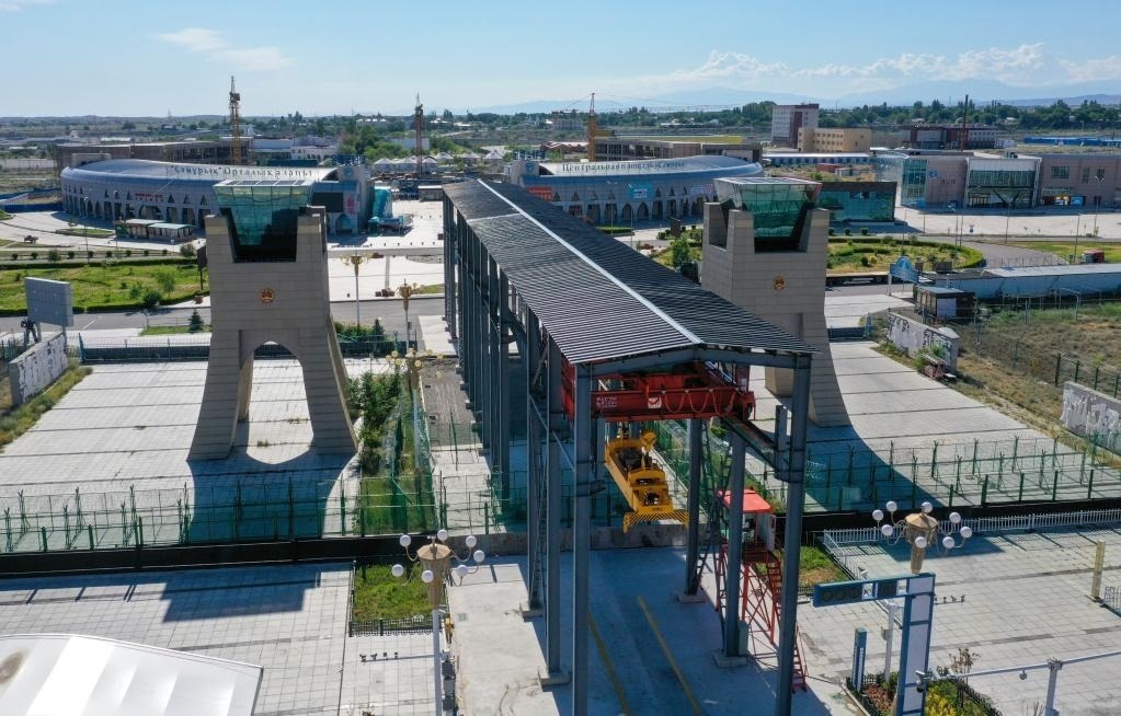 這是在新疆中哈霍爾果斯國(guó)際邊境合作中心拍攝的“空中陸橋”(無(wú)人機(jī)照片)。