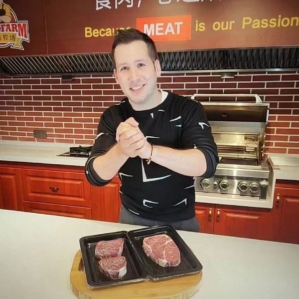人民網(wǎng)北京3月24日電(符園園、古娜)“大家好,我是小高。一到冬天,我最愛吃的就是香噴噴熱乎乎的火鍋。所以我給大家?guī)砹宋覀兙臏蕚涞幕疱佁撞??!敝辈ラg的高博睿,說著一口流利的中文,熟練地向大家介紹自己的牛肉產(chǎn)品。
