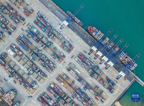 在海南環(huán)新英灣地區(qū)拍攝的洋浦國(guó)際集裝箱碼頭(無人機(jī)照片,2月28日)。新華社記者 蒲曉旭 攝