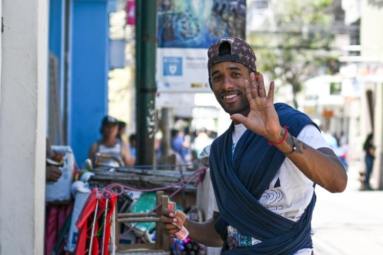 3月26日,一名男子在洪都拉斯首都特古西加爾巴一處街道上面對鏡頭揮手致意。新華社記者辛悅衛(wèi)攝