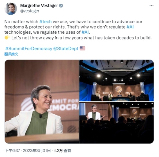 同一天,歐盟“適應(yīng)數(shù)字時代的歐洲”委員會執(zhí)行副主席瑪格麗特·維斯塔格(Margrethe Vestager)在社交媒體上表示,她對人工智能的態(tài)度傾向于“不限制人工智能技術(shù)的發(fā)展,但會監(jiān)管其使用”。