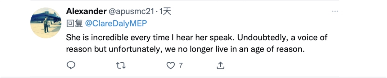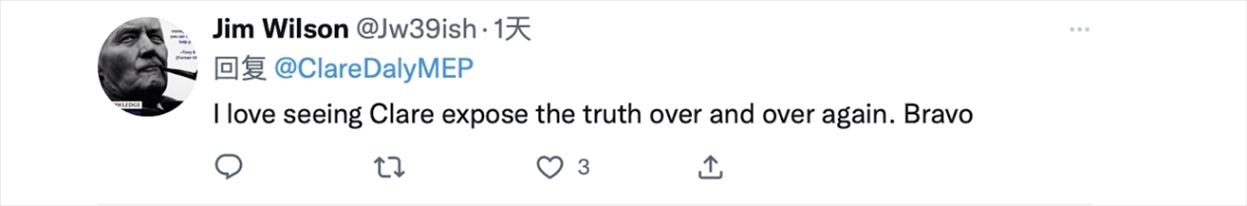 克萊爾·戴利的推文正是她在歐洲議會發(fā)言中所提到的內容。在視頻中,克萊爾·戴利首先抨擊了西方對華問題上的雙標行為。她在發(fā)言時稱,“人們在暴露分裂的同時談論著團結,他們一邊在歐盟向烏克蘭提供武器,一邊與中國談論和平。他們哀嘆中國在臺灣地區(qū)‘挑釁’,但對美國干涉國際公認的中國領土卻只字未提。”